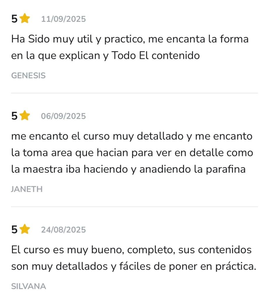 La combinación de teoría, práctica y módulos de emprendimiento, hace que incluso quienes no tienen experiencia previa puedan aprender paso a paso. Además, los bonos exclusivos como moldes personalizados, portavelas, fanales y ebooks complementan la formación, permitiéndote diferenciar tu marca y ofrecer productos más completos.